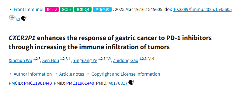 最新發(fā)表在《Front Immunol》(IF=5.9)的研究給出了關(guān)鍵答案——長鏈非編碼RNA CXCR2P1!研究發(fā)現(xiàn),CXCR2P1不僅能顯著增強(qiáng)腫瘤免疫浸潤,還能預(yù)測患者預(yù)后,甚至通過調(diào)控microRNA機(jī)制提升PD-1抑制劑療效!