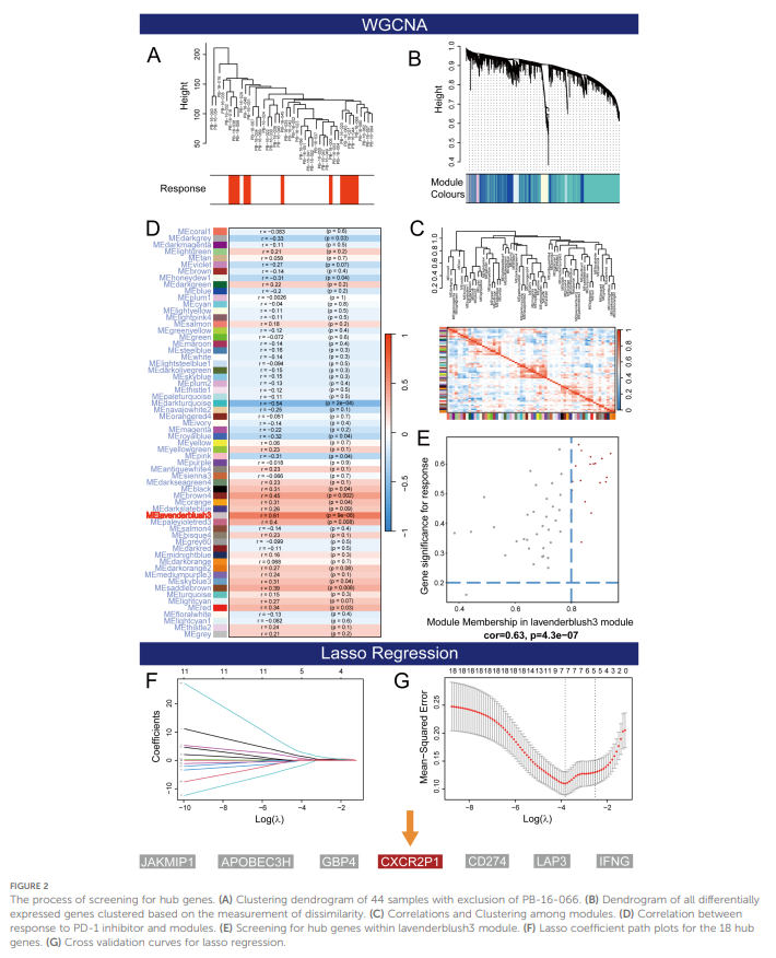 作者將模塊與臨床表型進(jìn)行相關(guān)性分析,發(fā)現(xiàn)模塊lavenderblush3與腫瘤的免疫反應(yīng)相關(guān)性最高(F2D)。F2E顯示GS與MM之間存在顯著相關(guān)性,作者選擇GS>0.2且MM>0.8的基因作為樞紐基因。為了降低樞紐基因間的共線性,還進(jìn)行了lasso回歸分析。在交叉驗證中,當(dāng)模型中的變量數(shù)減少到7個時,模型的均方誤差降至最低點,方程的擬合效果達(dá)到最佳(圖2G)。由于CXCR2P1影響細(xì)胞表型的機(jī)制尚不明確,因此選擇其進(jìn)行后續(xù)分析。