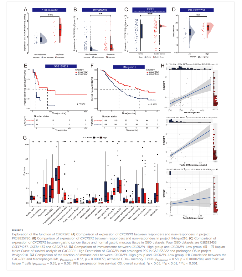 胃癌患者的預(yù)后與他們對PD-1抑制劑的反應(yīng)高度相關(guān)。通過分析不同的數(shù)據(jù)集,作者發(fā)現(xiàn)在項目PRJEB25780(F3A)和項目IMvigor210(F3B)中,應(yīng)答者的CXCR2P1表達(dá)高于無應(yīng)答者。在四個GEO數(shù)據(jù)集中,胃癌組織中CXCR2P1的表達(dá)高于正常組織(F3C)。通過KM曲線,作者發(fā)現(xiàn)CXCR2P1高組在轉(zhuǎn)移性尿路上皮癌患者的OS延長(F3F),在肺癌患者的PFS延長(F3E)。