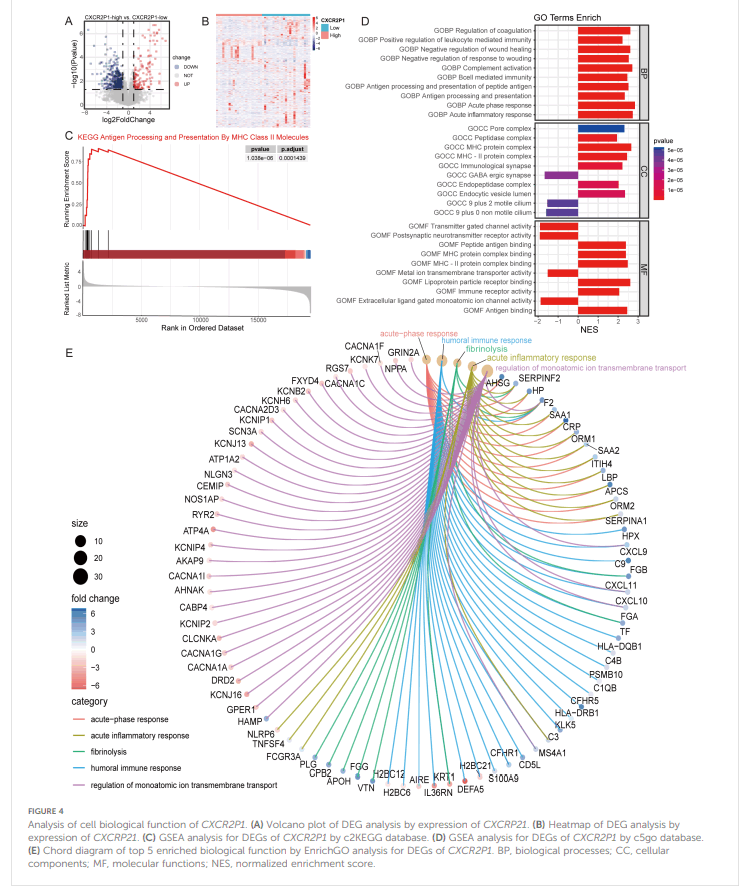 通過差異表達(dá)分析,發(fā)現(xiàn)CXCR2P1高表達(dá)組與低表達(dá)組之間有610個DEG(F4A-B)。為探究CXCR2P1的細(xì)胞生物學(xué)功能,對這些DEG進(jìn)行EnrichGO和GSEA分析,結(jié)果提示CXCR2P1可能通過增強(qiáng)MHCII蛋白復(fù)合物在腫瘤免疫微環(huán)境中的抗原呈遞,從而增加腫瘤組織中免疫細(xì)胞的浸潤。