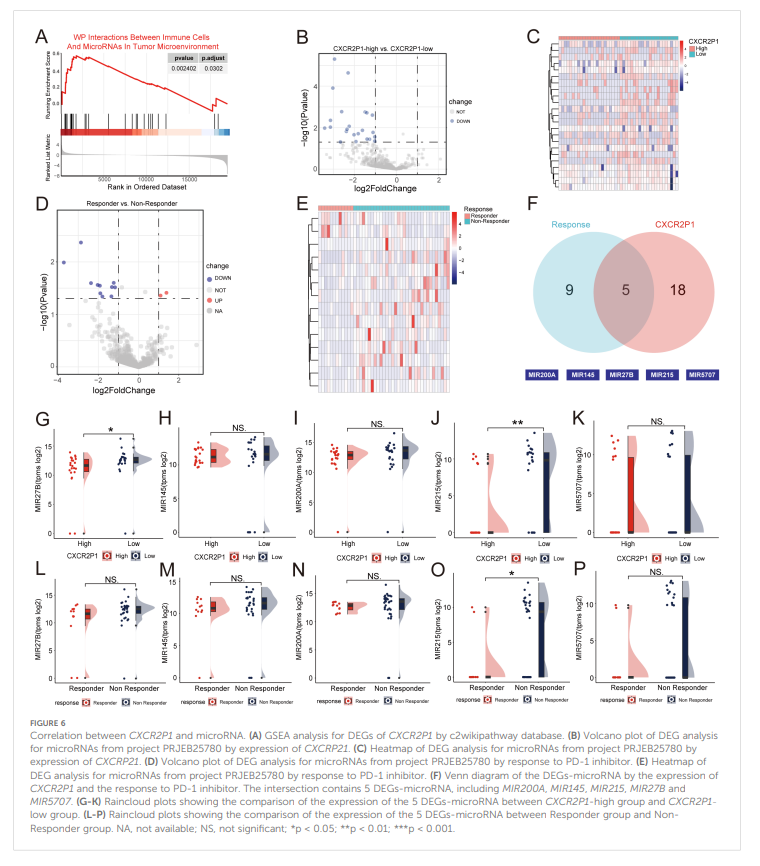 c2wikipathway數(shù)據(jù)庫的GSEA結(jié)果顯示,CXCR2P1在“腫瘤微環(huán)境中免疫細(xì)胞與microRNA的相互作用”欄目中顯著富集(F6A),提示CXCR2P1可能通過microRNA調(diào)控PD-L1的表達(dá)。為了進(jìn)一步明確哪些microRNA參與了CXCR2P1的上下游信號通路,作者首先對項目PRJEB25780中所有microRNA按CXCR2P1的表達(dá)情況進(jìn)行DEG分析,然后對PRJEB25780中所有microRNA根據(jù)PD-1抑制劑的應(yīng)答情況進(jìn)行DEG分析,再將兩組microRNA基因集取交集,共得到5個基因。結(jié)果顯示,MIR215的表達(dá)在CXCR2P1-High組(F6J)和Responder組(F6O)中均顯著下調(diào)。提示MIR215可能參與了CXCR2P1的信號通路,并作為CXCR2P1影響細(xì)胞表型的介質(zhì)。