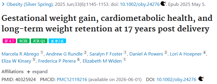 2025年6月,外國學者在《Obesity》(中科院醫(yī)學2區(qū),IF=4.7)發(fā)表標題為:“Gestational weight gain, cardiometabolic health, and long-term weight retention at 17 years post delivery”的研究論文。