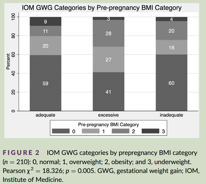 對210名在產(chǎn)后17年被隨訪且符合資格標準的母親進行了完整病例分析?;€參與者的描述性特征和隨訪特征如表1所示。分析樣本中的母親與原始隊列具有可比的特征。根據(jù)2009年IOM指南,大多數(shù)母親(60%)有過度總孕期體重增加。根據(jù)χ2檢驗,有過度GWG的女性比例因孕前BMI而異(p = 0.005);與超重(24%)、肥胖(20%)或體重不足(5%)的女性相比,孕前正常體重的女性(50%)中有更大比例有過度GWG(圖2)。IOM指南的依從性不受種族和民族、教育水平、生育次數(shù)、婚姻狀況、食物不安全狀況或獲得公共援助的影響(p > 0.05)。